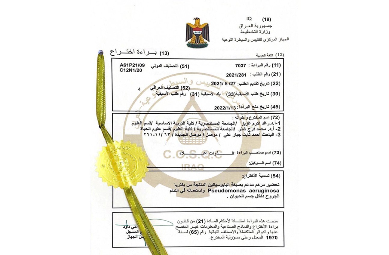فريق بحثي من الجامعة المستنصرية يحصل على براءة اختراع لتمكنه من تحضير مرهم يعمل على التئام الجروح داخل جسم الحيوان