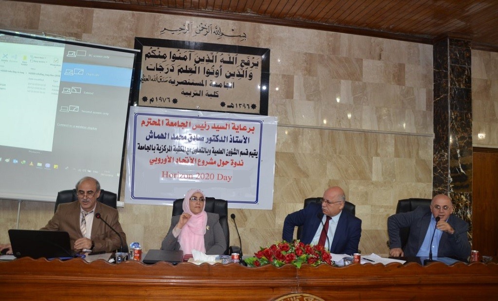 نظم قسم الشؤون العلمية في الجامعة المستنصرية، ورشة عمل عن مشروع الأفق العلمي HORIZON 2020 الممول من الإتحاد الأوروبي، بمشاركة عدد من الباحثين والتدريسيين من مختلف كليات الجامعة.