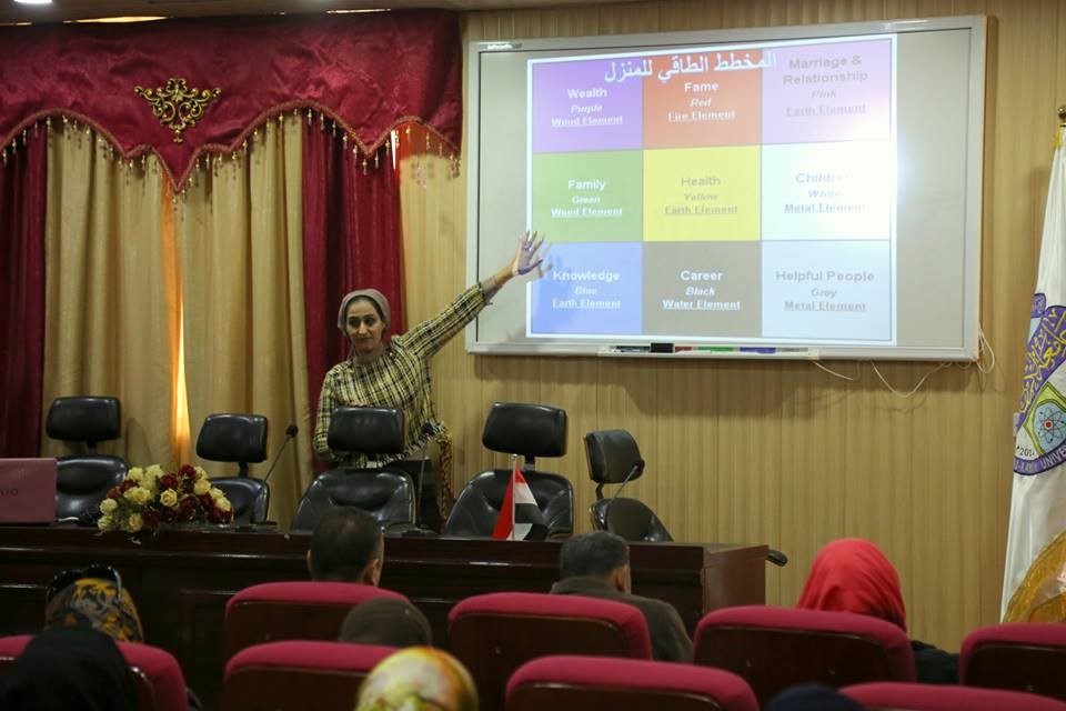 وتضمنت الورشة التي قدمتها الدكتورة سالي حامد القطبي، شرح العوامل المؤثرة في تصميم المنازل، وأساسيات ضبط طاقة المكان والتي تشمل، شكل المخطط الهندسي، وأختيار الالوان، وآلية موازنة العناصر الخمسة النار والتراب والخشب والمعدن والماء.