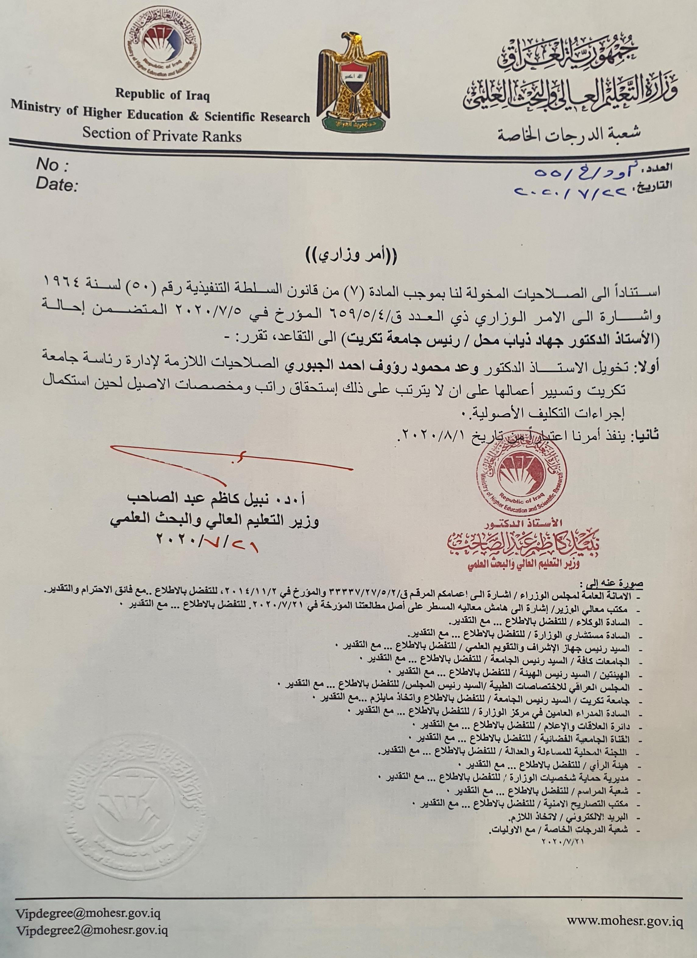 كلف وزير التعليم العالي والبحث العلمي الأستاذ الدكتور نبيل كاظم عبد الصاحب رئيسا جديدا لجامعة تكريت خلفا للدكتور جهاد ذياب محل الذي أحيل على التقاعد.