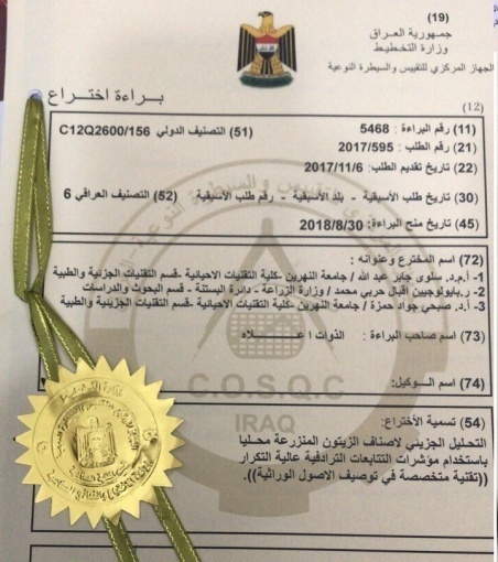 Two faculty members in the College of Biotechnology, University of Al-Nahrain obtained the patent on a specialized technique to characterize the genetic assets The patent highlighted the molecular analysis of the local cultivated olive via using a high frequency tandem sequence indices with specialized DNA characterization technology. The patent reviewed that the genetic software based on the DNA to distinguish the different breeds or varieties and the ability to test the seeds in preparation for the emergence of a local olive species with special genetic characteristics. The patent also reviewed implementing a high-precision and elective technique that selects fixed sites in the genome to associate with them.