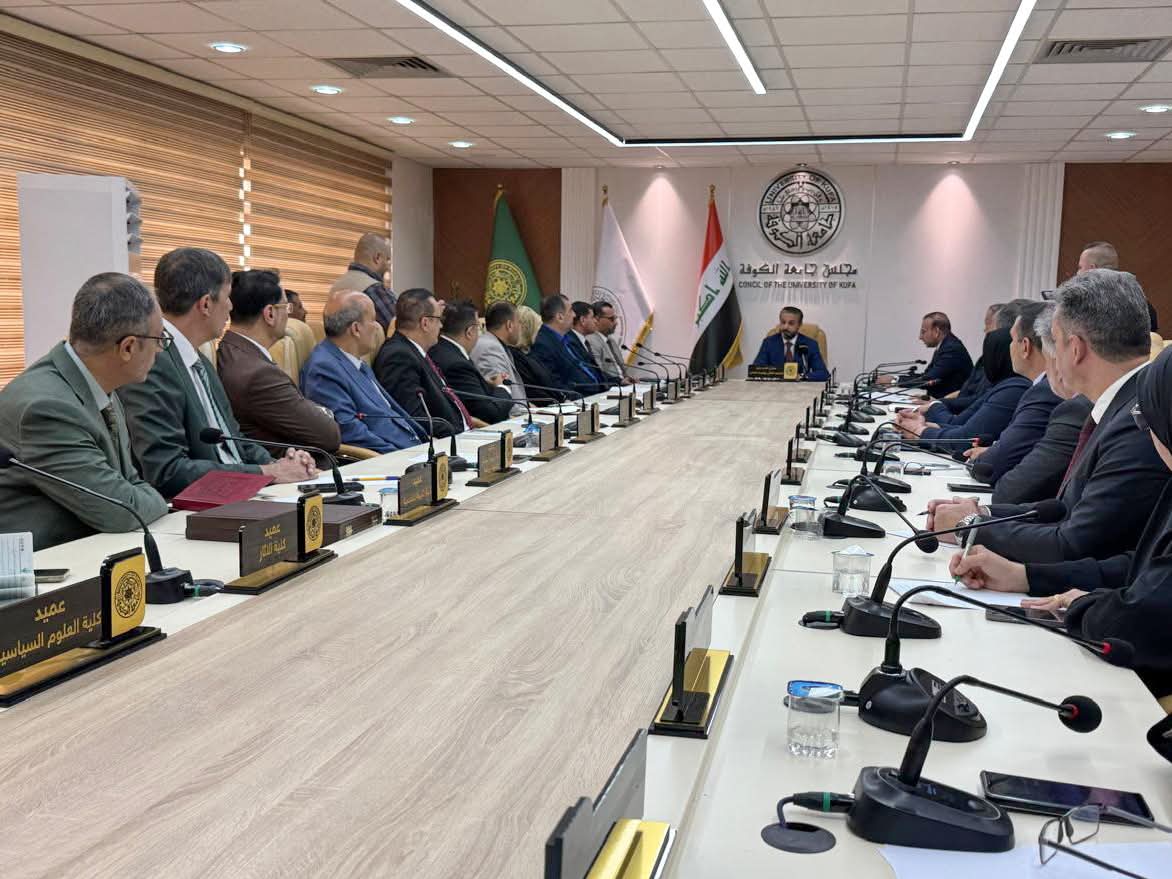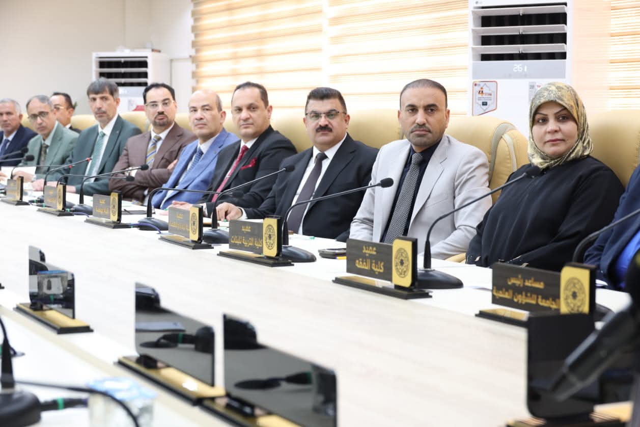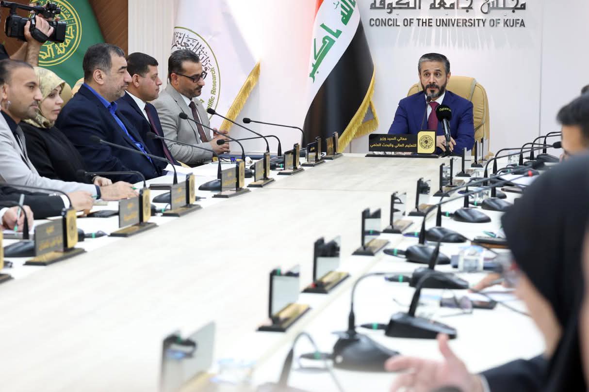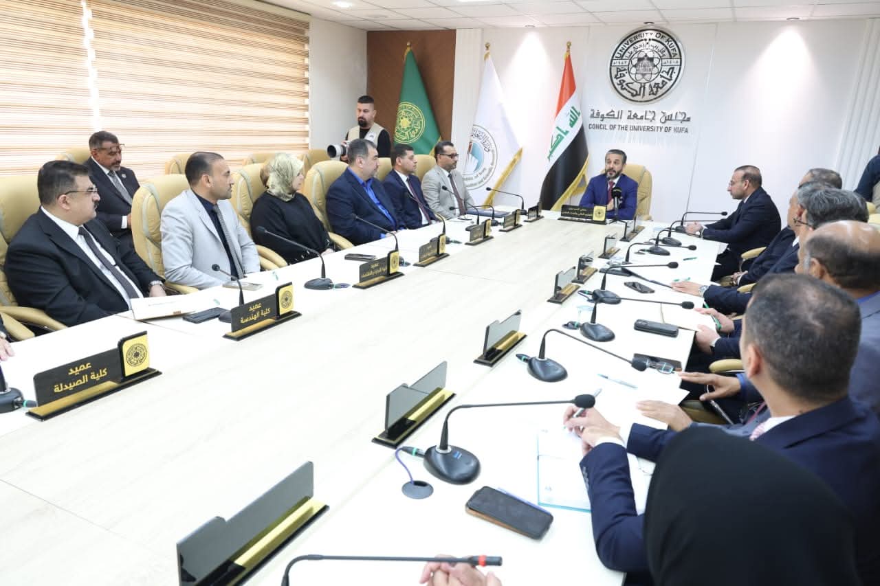 During a meeting with the University Council, His Excellency, Minister of Higher Education and Scientific Research, Dr. Naeem Abd Yaser Al-Aboudi reviewed the educational process and development projects implemented at the University of Kufa.