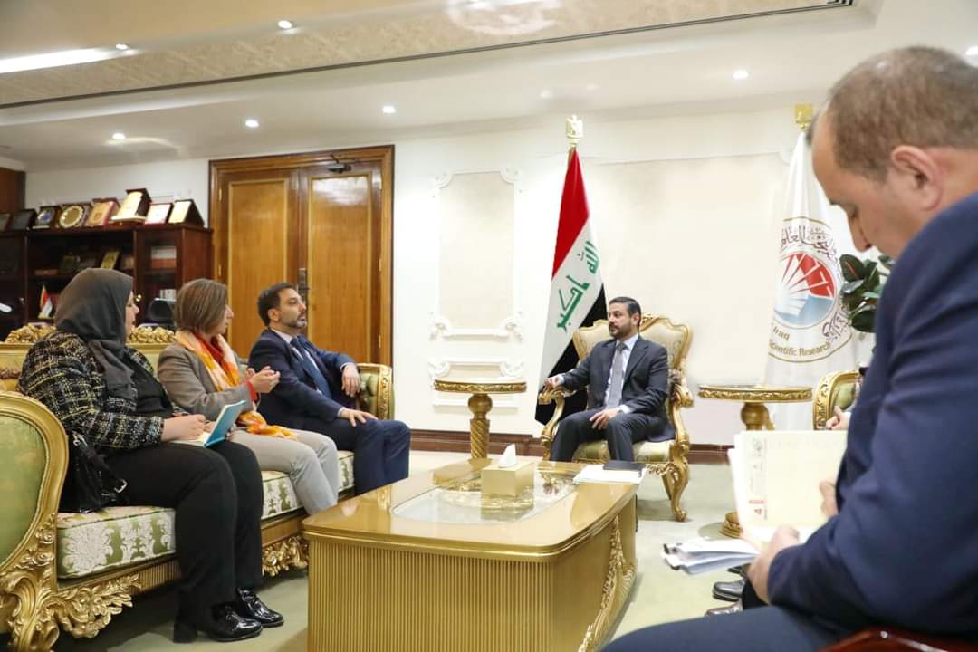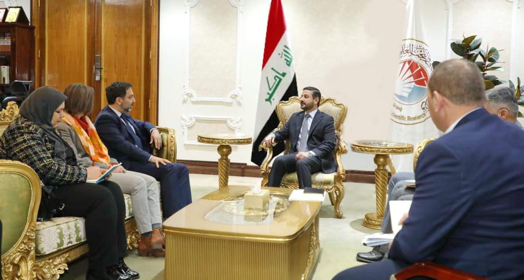During a meeting with the Director of the World Bank's office in Iraq and the bank's projects officer in the Middle East region, Mr. Richard Abdul Nour and his accompanying delegation, His Excellency, Minister of Higher Education and Scientific Research, Dr. Naeem Abd Yaser Al-Aboudi reviewed the aspects of joint action towards supporting the environment of Higher Education and Scientific Research in Iraq and completing university projects, especially with regard to the development of centers of excellence that would contribute to the development of the research aspect and support fields of work in modern specialties, as well as enabling the private sector to have positive partnerships with academic institutions to modernize the curricula and the educational process and develop the skills of graduates.