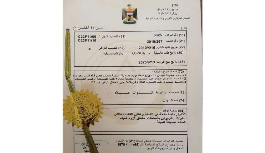 A joint research team in the Universities of Karbala and Babylon obtained a patent in the field of chemistry.