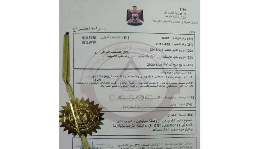 A research team in the College of Science, University of Mosul, Dr. Anwar Mustafa Ezzat Al-Faidi, Dr. Bassam Mahmoud Al-Imam and Dr. Muhammad Mahmoud Younis obtained a patent on manufacturing a Nano-diode from (Si-CNT Junction) via plasma spraying for the first time without a catalyst. The patent reviewed manufacturing Nano-carbon tubes (the used carbon’s purity is 99%) without an auxiliary agent for the first time. The patent, in which granted by the Central Organization for Standardization and Quality Control Unit of the Ministry of Planning, demonstrated a new method for depositing carbon in isolation from any contamination with very high purity in the form of (very fine) carbon nanotubes via plasma sputtering, which is being done for the first time in Iraq.