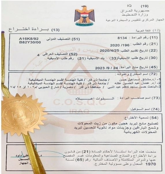 University of Thi-Qar obtained a joint patent on manufacturing of a hybrid cooling inhibitor composed of transformer oil, paraffin wax and Nano-material particles to improve the cooling of electrical transformers.