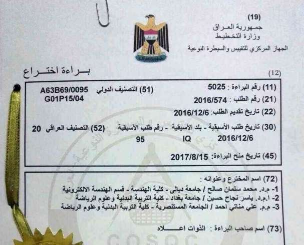 The patent, in which granted by the Central Organization for Standardization and Quality Control Unit of the Ministry of Planning, reviewed manufacturing a device that operates via electronic circuit controlled by using a microprocessor and sensors to measure the strength of the hit and save the data of each player individually.