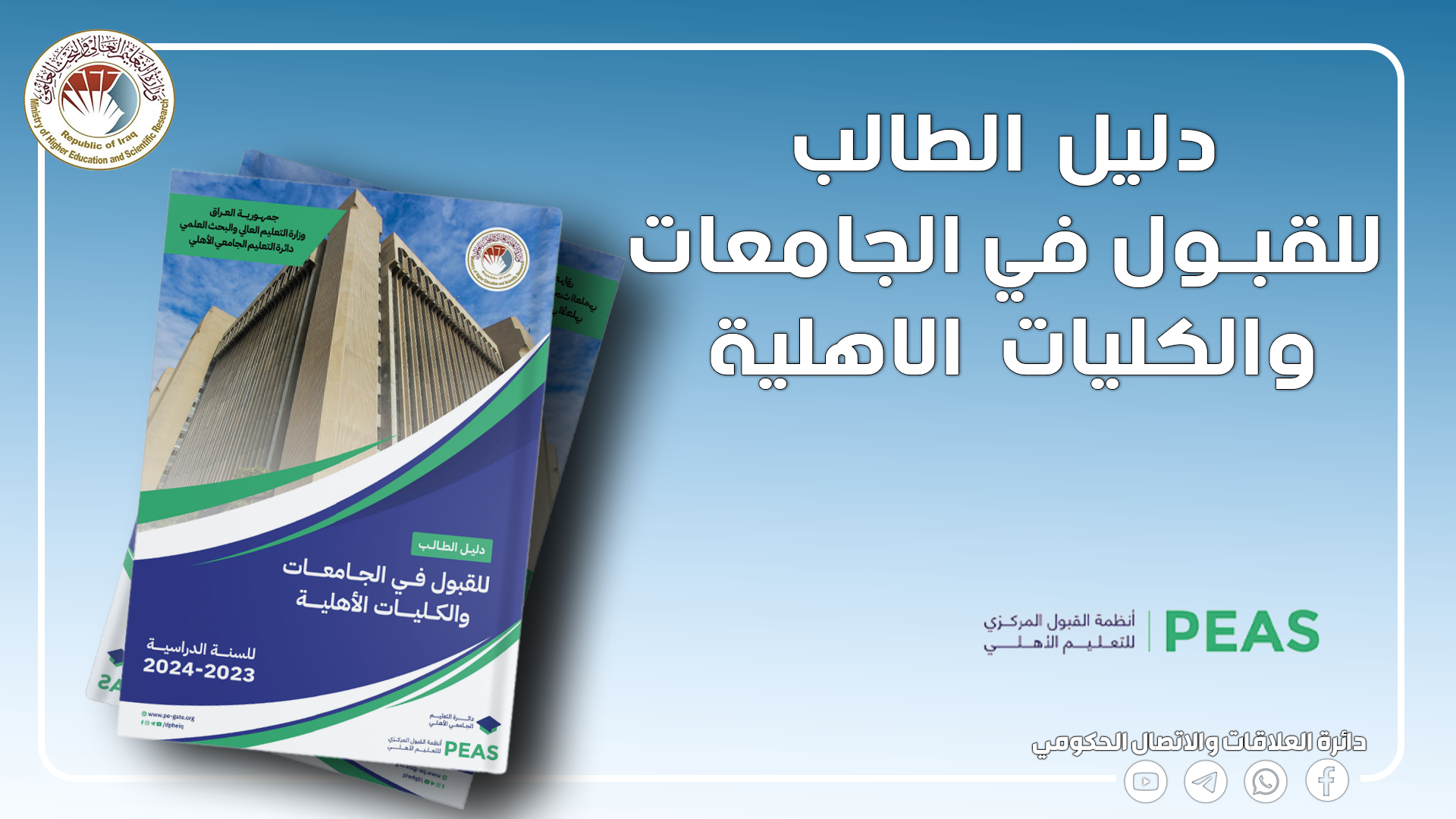وتدعو وزارة التعليم العالي والبحث العلمي أبناءها الطلبة الى الاطلاع على دليل الطالب للتعرف على الجامعات والكليات الاهلية وأقسامها وتخصصاتها وتؤكد أنه سيتاح أمام الطلبة ملء بياناتهم ومصادقتها إلى ما بعد ظهور نتائج الدور الثاني للدراسة الإعدادية.