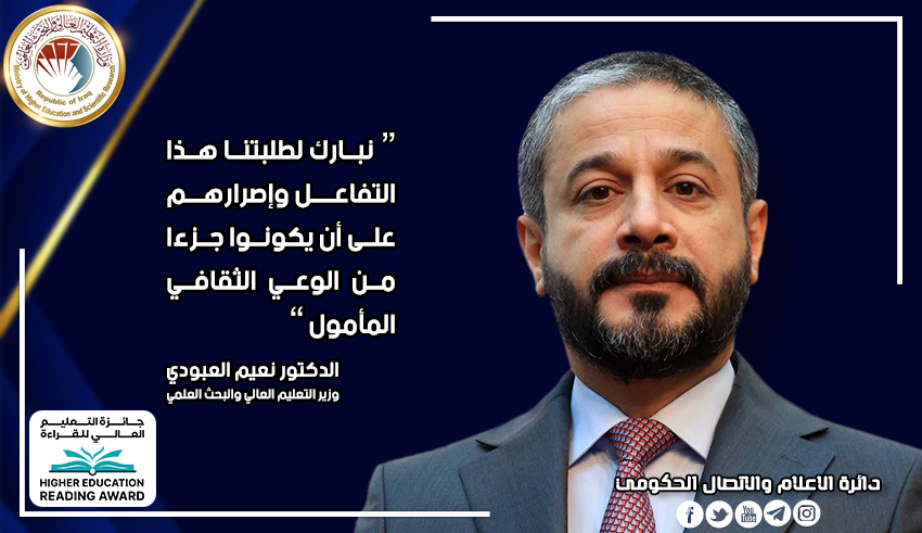 (تابعنا باهتمام اختبار جائزة التعليم العالي للقراءة ونعلن بفخر واعتزاز نجاح المسابقة التي شهدت تنافس (19573) طالبا من الجامعات الحكومية والأهلية ونبارك لهم هذا التفاعل الجاد وإصرارهم على أن يكونوا جزءا من الوعي الثقافي المأمول.