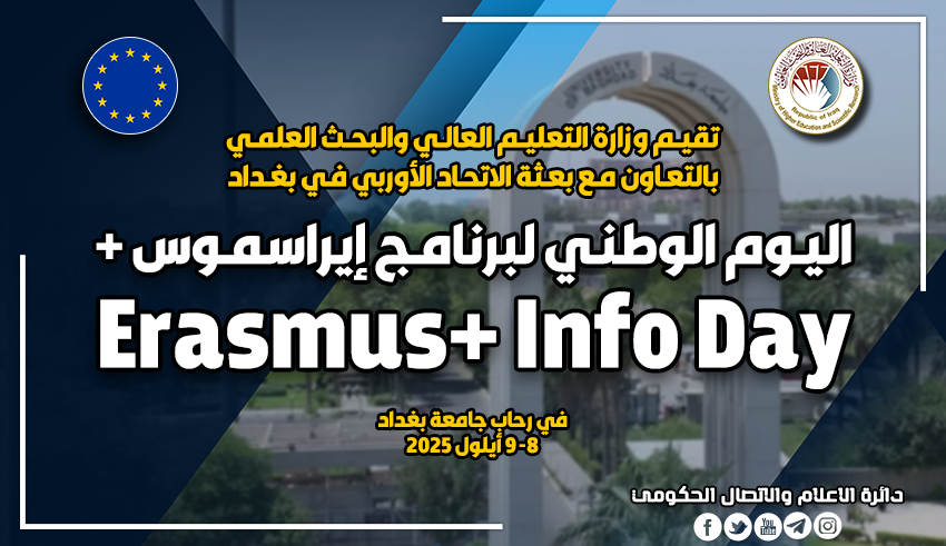 تنظم وزارة التعليم العالي والبحث العلمي بالتعاون مع بعثة الاتحاد الأوربي في بغداد، فعاليات اليوم الوطني لبرنامج (+Erasmus) وذلك في رحاب جامعة بغداد للمدة من 8 إلى 9 أيلول 2025.