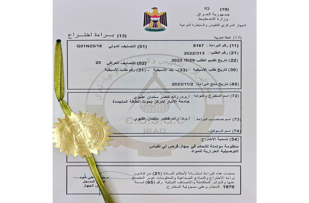 براءة اختراع في جامعة الأنبار عن منظومة مؤتمتة للتحكم في جهاز قرص لي لقياس التوصيلية الحرارية للمواد