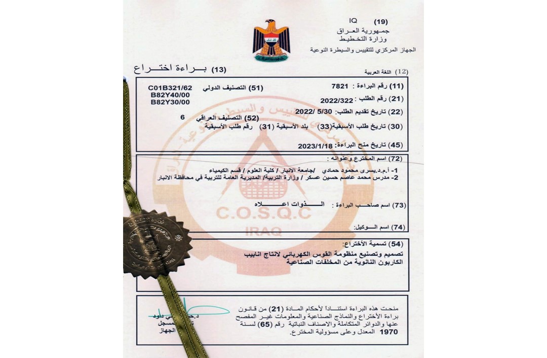 براءة اختراع في جامعة الانبار عن تصميم وتصنيع منظومة القوس الكهربائي لإنتاج انابيب الكاربون النانوية من المخلفات الصناعية