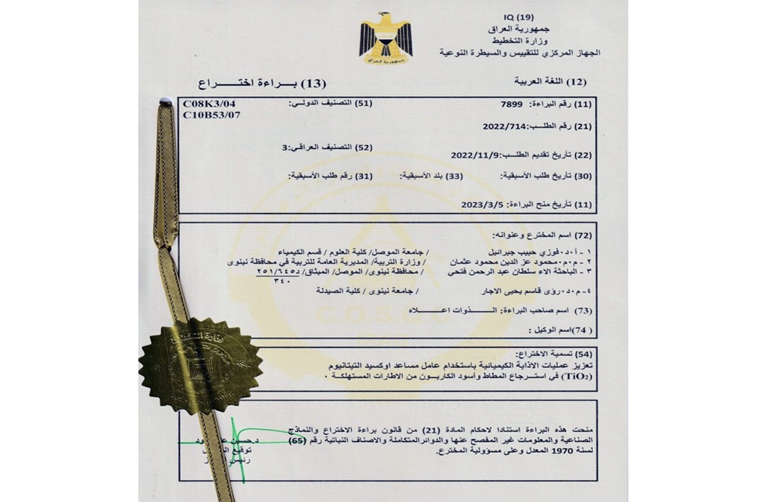 براءة اختراع في جامعة الموصل عن تعزيز عمليات الاذابة الكيميائية باستخدام عامل مساعد اوكسيد التيتانيوم (TiO2) في استرجاع المطاط وأسود الكاربون من الاطارات المستهلكة