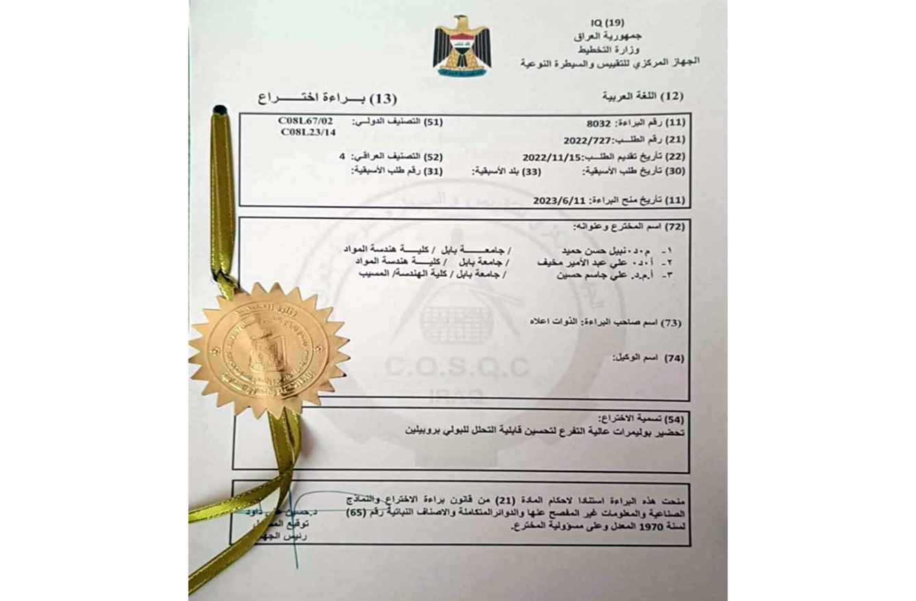 براءة اختراع في جامعة بابل عن تحضير بوليمرات عالية التفرع لتحسين قابلية التحلل للبولي بروبيلين