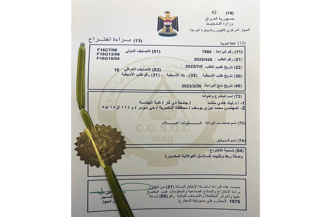 براءة اختراع في جامعة ذي قار عن تطوير وصلة ربط وتثبيت للسلاسل الفولاذية المكسورة