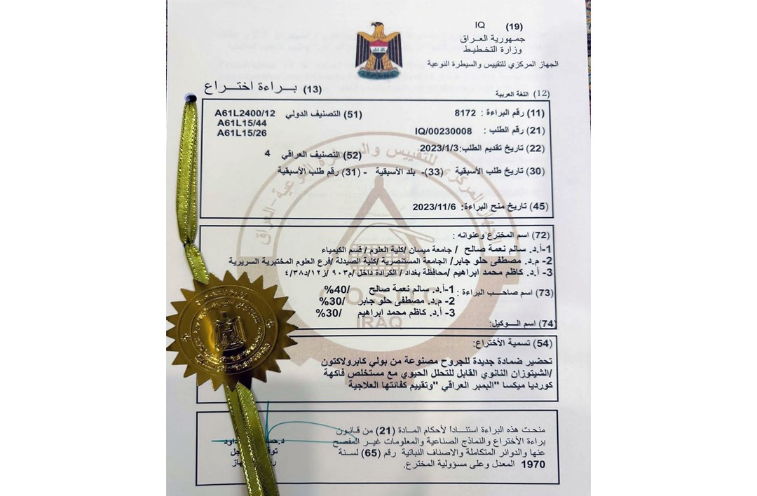 براءة اختراع مشتركة بين جامعتي المستنصرية وميسان عن تحضير ضمادة جديدة للجروح مصنوعة من بولي كاربولاكتون/ الشيتوزان النانوي القابل للتحلل الحيوي مع مستخلص فاكهة كورديا ميكسا "البمبر العراقي" وتقييم كفائتها العلاجية