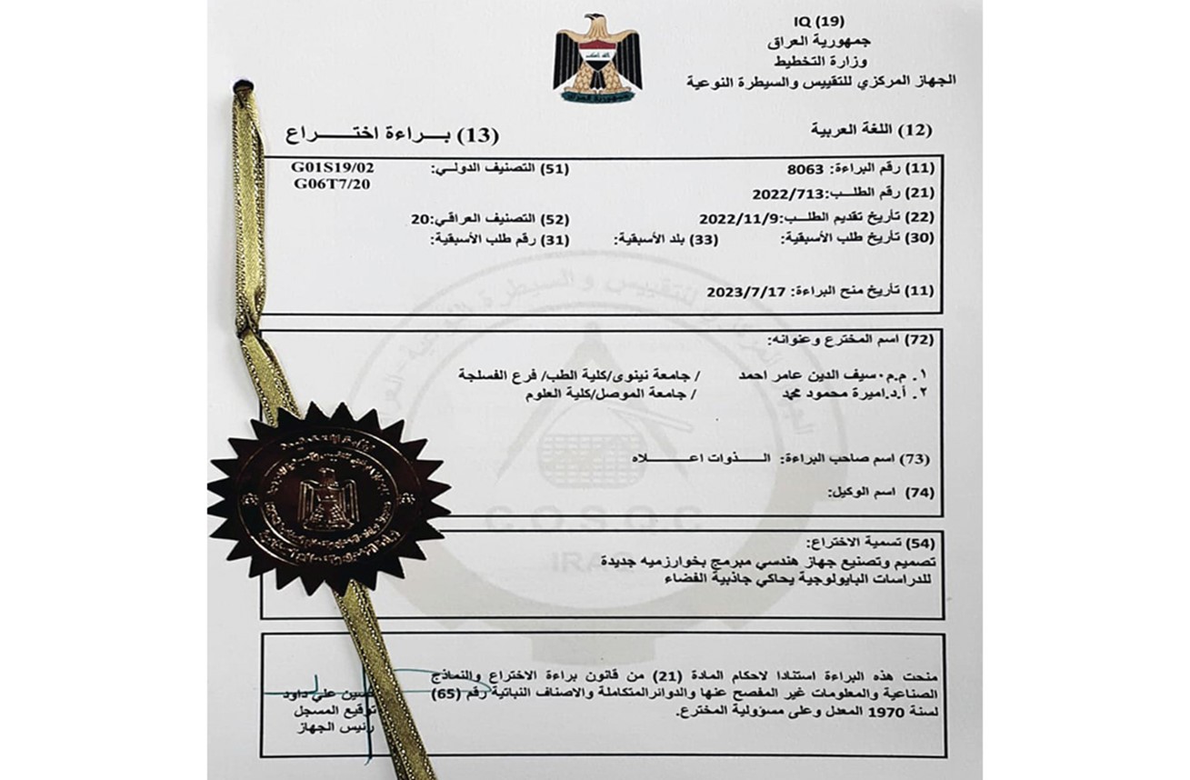 براءة اختراع مشتركة بين جامعتي الموصل ونينوى عن تصميم وتصنيع جهاز هندسي مبرمج بخوارزمية جديدة للدراسات البايولوجية يحاكي جاذبية الفضاء