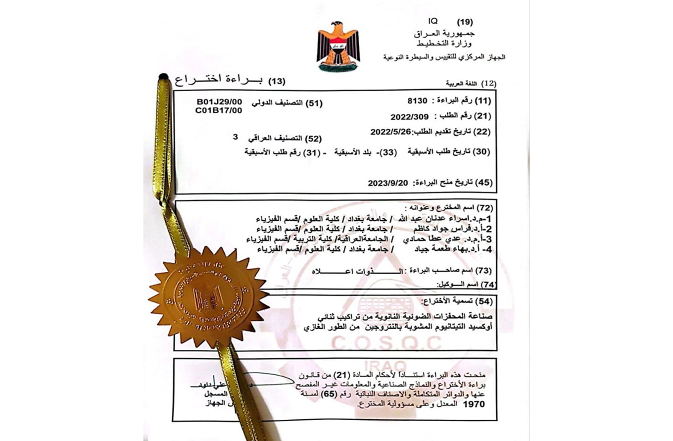 براءة اختراع مشتركة بين جامعتي بغداد والعراقية عن صناعة المحفزات الضوئية النانوية من تراكيب ثنائي أوكسيد التيتانيوم المشوبة بالنتروجين من الطور الغازي