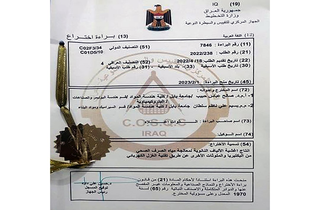 براءة اختراع مشتركة في جامعة بابل عن انتاج اغشية الألياف النانوية لمعالجة مياه الصرف الصحي من البكتريا والملوثات الأخرى عن طريق تقنية الغزل الكهربائي