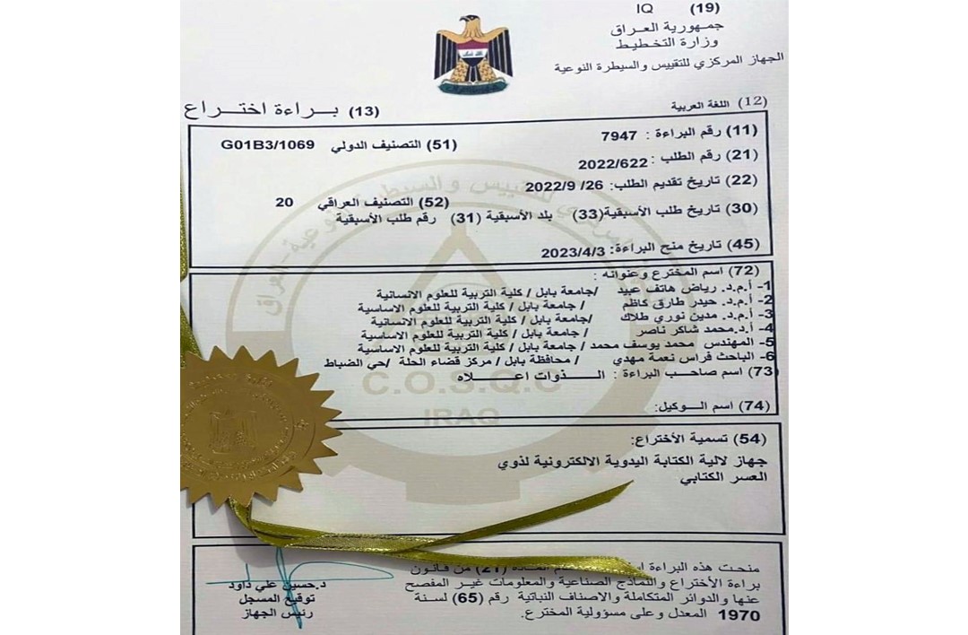 براءة اختراع مشتركة في جامعة بابل عن تصنيع جهاز لألية الكتابة اليدوية الالكترونية لذوي العسر الكتابي