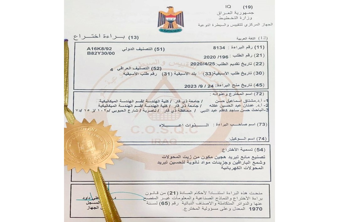 براءة اختراع مشتركة في جامعة ذي قار عن تصنيع مانع تبريد هجين مكون من زيت المحولات وشمع البارافين وجزيئات مواد نانوية لتحسين تبريد المحولات الكهربائية
