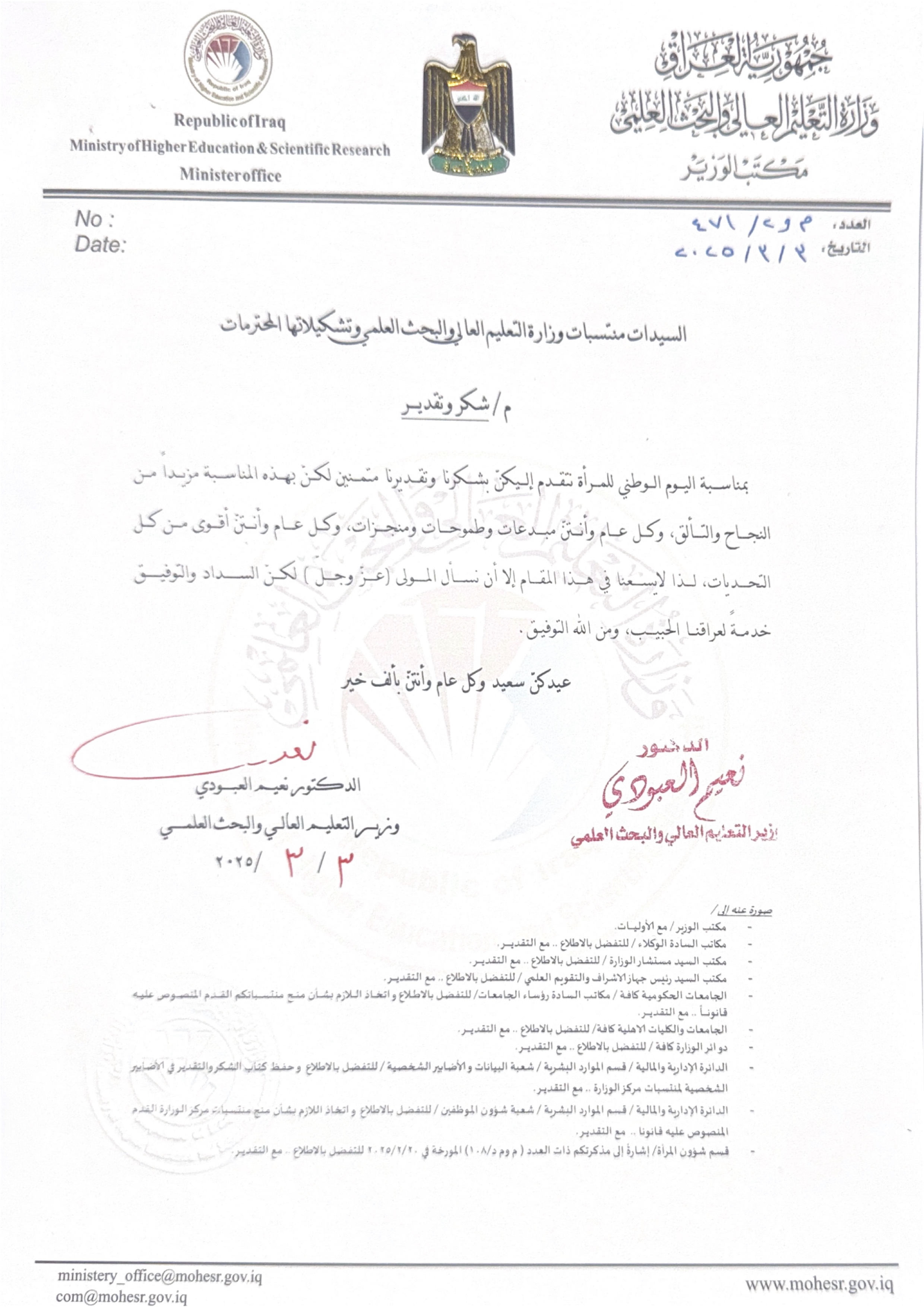 بمناسبة اليوم الوطني للمرأة العراقية .. وزير التعليم الدكتور نعيم العبودي يوجه شكره وتقديره الى منتسبات وزارة التعليم العالي والبحث العلمي وتشكيلاتها