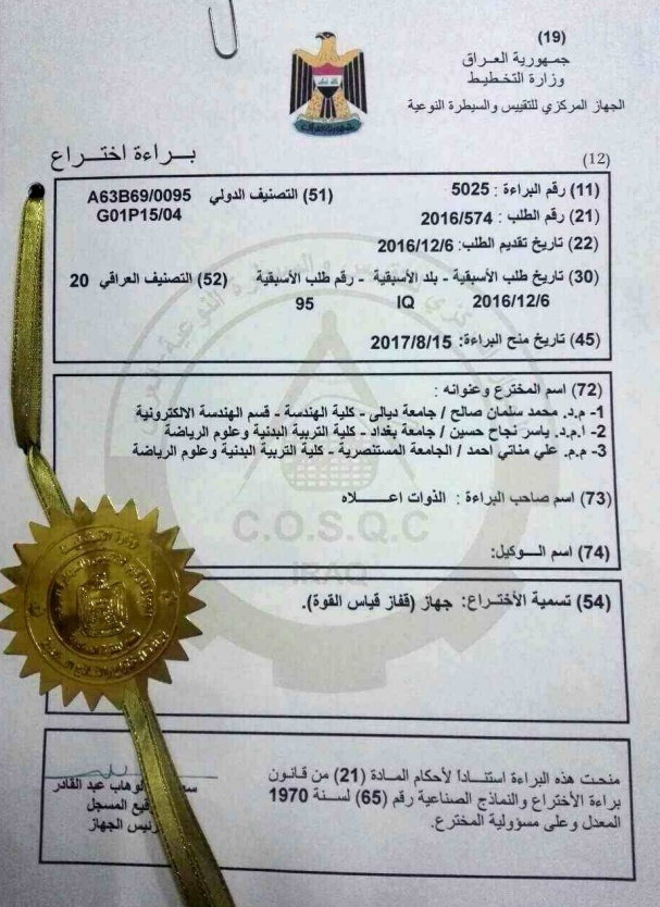 حصل فريق بحثي من جامعات ديالى وبغداد والمستنصرية, على براءة اختراع صناعة جهاز قفاز لقياس القوة يعمل على قياس قوة الضربة لدى لاعبي كرة الطائرة والسلة والممنوحة من وزارة التخطيط.