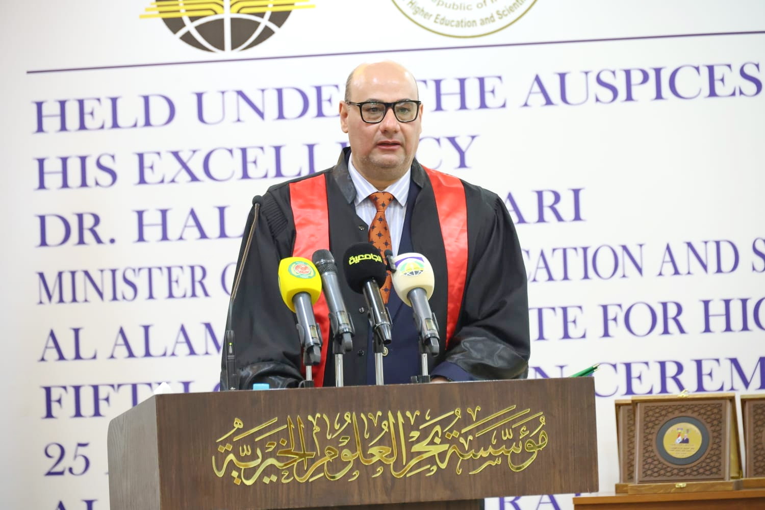 وأكد في كلمته خلال احتفالية التخرج والتكريم بحضور السادة محافظ النجف الاشرف ورئيس مجلسها وعدد من أعضاء مجلس النواب والوزراء السابقين ورؤساء الجامعات وممثلي مؤسسة بحر العلوم الخيرية أن نيل الدرجات والشهادات العليا يمثل قيمة كبرى للطالب ورصيدا وطنيا يتجسد بالعقول القادرة على الإسهام في التنمية وصنع القرار ومعالجة التحديات ورفد مؤسسات الدولة بالخبرات العلمية الرصينة.