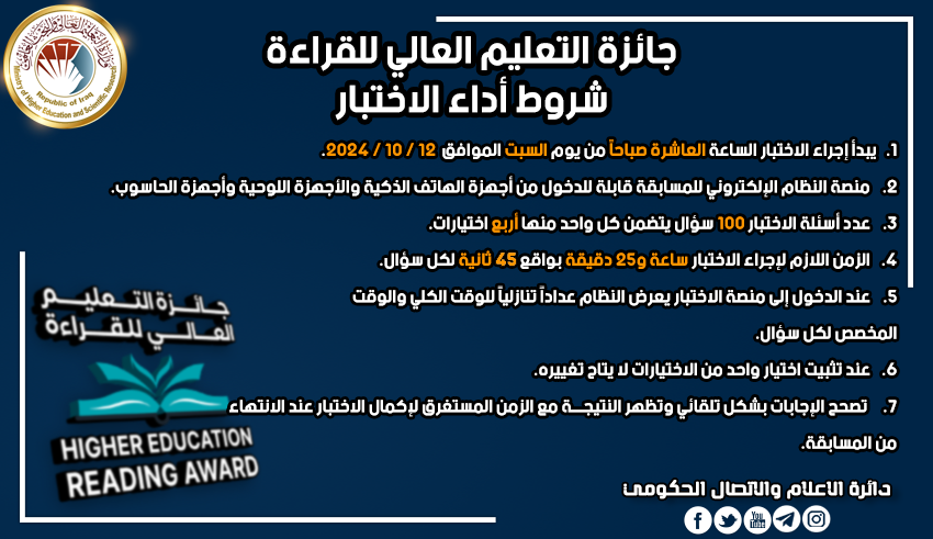 تعلن وزارة التعليم العالي والبحث العلمي أن الاختبار الخاص بجائزة التعليم العالي للقراءة سيكون يوم السبت الموافق 2024/10/12 على وفق الشروط الآتية????: