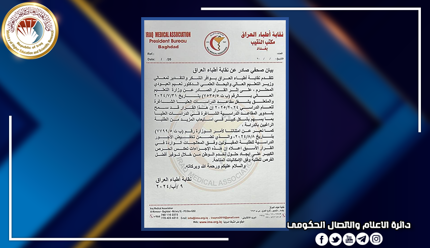 وجاء في نص بيانها: تتقدم نقابة أطباء العراق بوافر الشكر والتقدير لمعالي وزير التعليم العالي والبحث العلمي الدكتور نعيم العبودي المحترم، على إثر القرار الصادر عن وزارة التعليم العالي بالرقم (ب ت 5/7535) بتاريخ 2024/7/31 والمتعلق بشغل مقاعد الدراسات العليا الشاغرة للعام الدراسي 2025/2024.