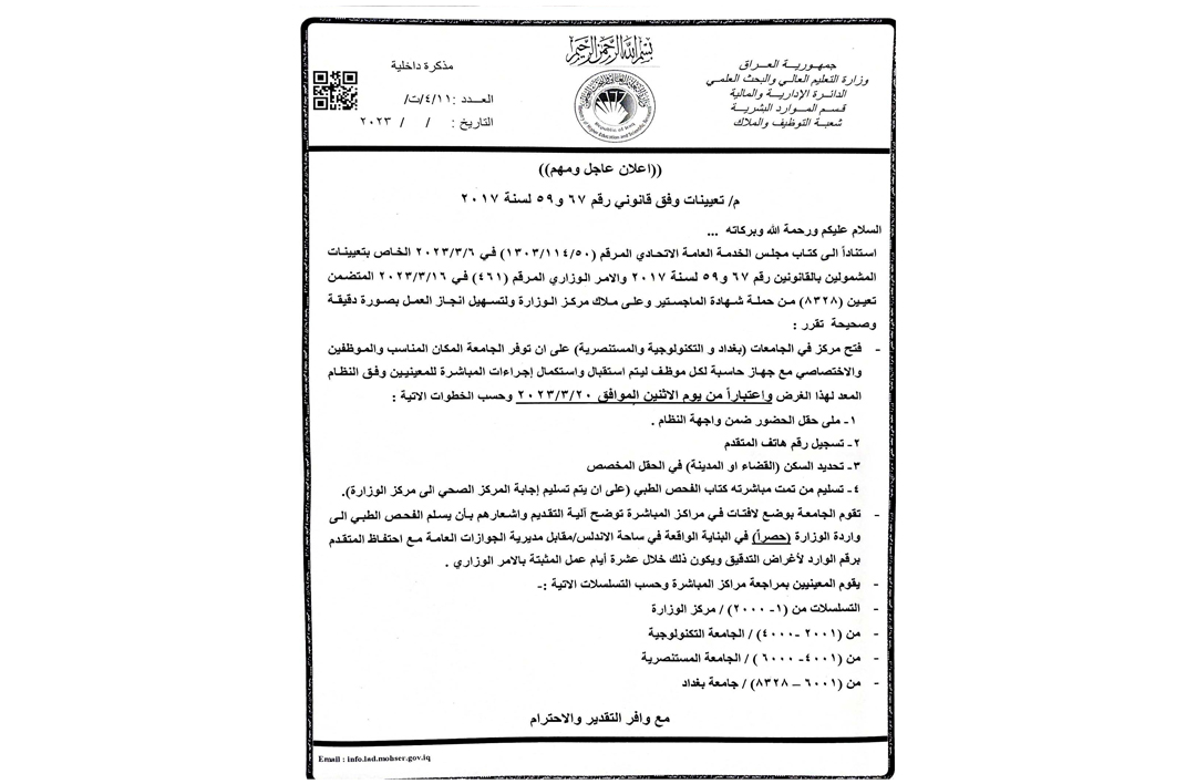 وزارة التعليم تقرر فتح مراكز إضافية في جامعات بغداد والتكنولوجية والمستنصرية لتسهيل إجراءات المباشرة للمشمولين بالأمر الوزاري المتضمن تعيين 8328 من حملة شهادة الماجستير وتحدد آلية توزيع المراجعين على المراكز والشروع بها اعتبارا من يوم الاثنين الموافق 2023/3/20