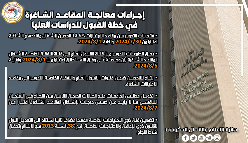 وزير التعليم العالي والبحث العلمي الدكتور نعيم العبودي يوجه بإشغال خطة الدراسات العليا وتخويل الجامعات معالجة الحالات الحرجة في الامتحان التنافسي