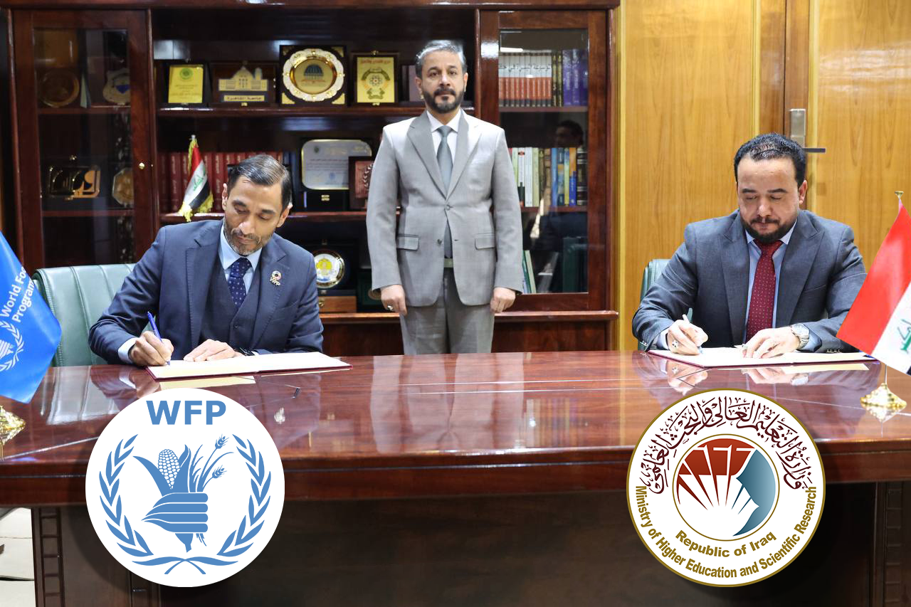 رعى وزير التعليم العالي والبحث العلمي الدكتور نعيم العبودي توقيع اتفاق تنفيذي مع برنامج الأغذية العالمي للأمم المتحدة للتعاون في مجالات تدريب وتطوير مهارات الخريجين.