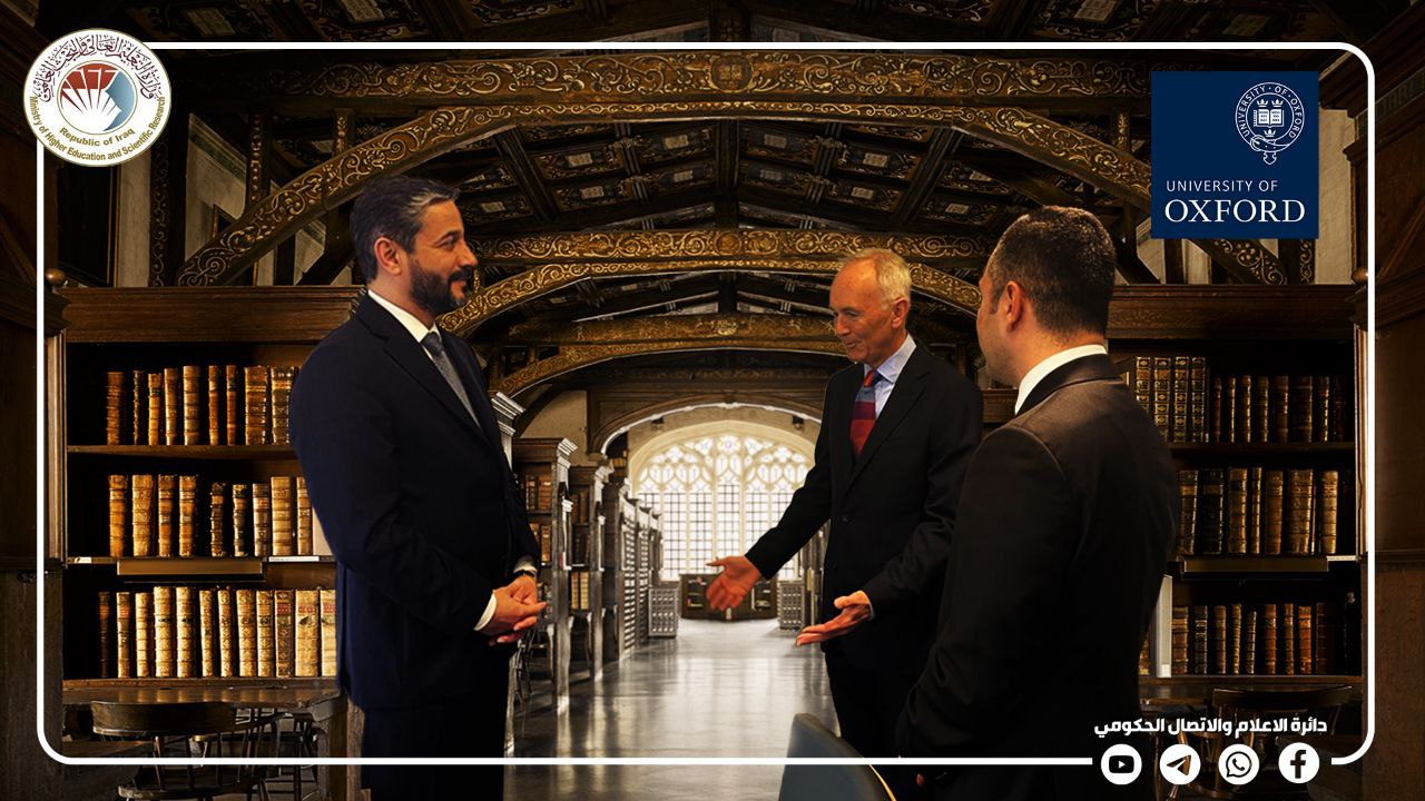 زار وزير التعليم العالي والبحث العلمي الدكتور نعيم العبودي جامعة أكسفورد واطلع على بيئتها التعليمية وأروقتها ومكتبتها والتقى مع عدد من ممثلي الجامعة ومنهم رئيس كلية ولفسون السير تيم هيتشنز.