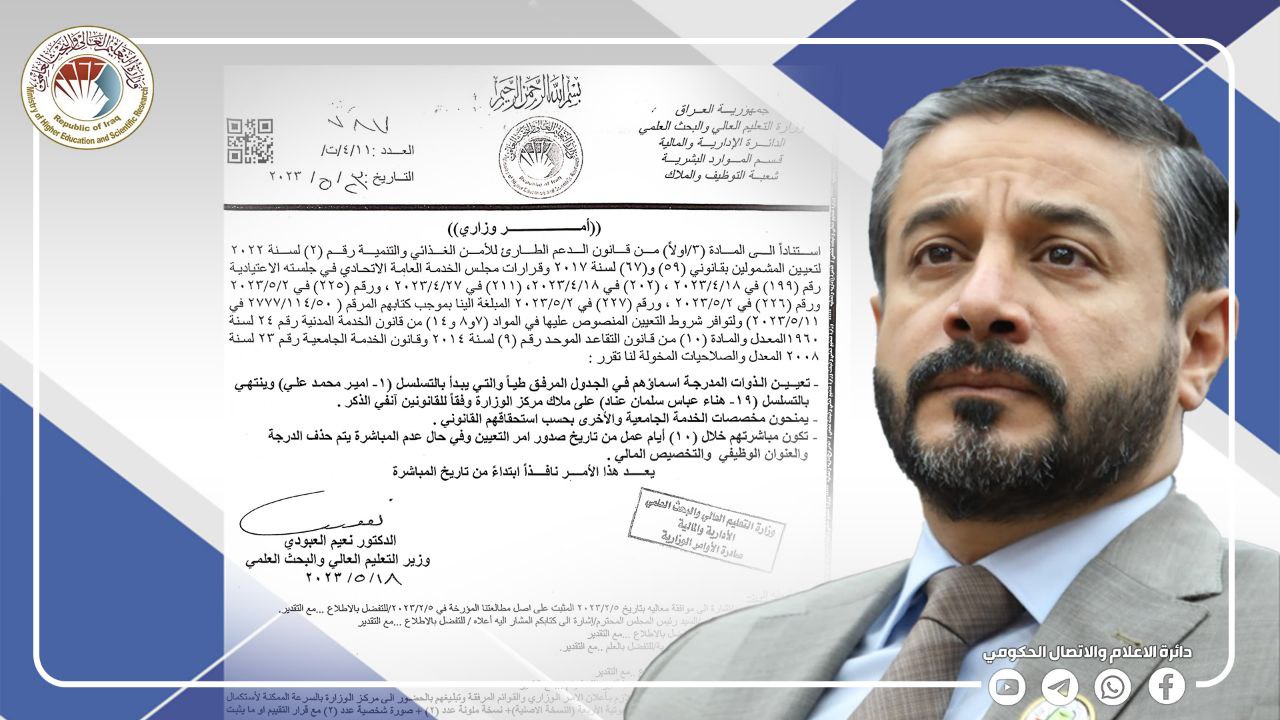 العلمي الدكتور نعيم العبودي أمرا وزاريا بتعيين تسعة عشر من حملة شهادات