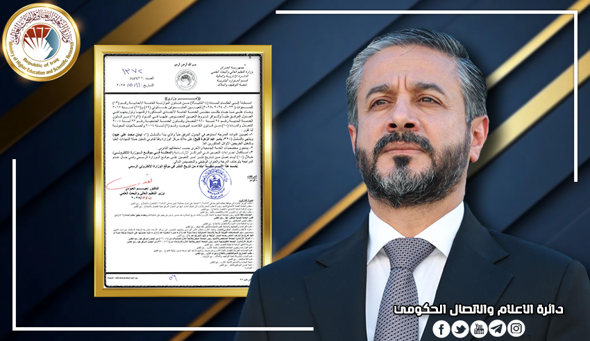 أصدر وزير التعليم العالي والبحث العلمي الدكتور نعيم العبودي أمرا وزاريا بتعيين (320) من حملة الشهادات العليا والأوائل على ملاك مركز الوزارة استنادا إلى القرارات والتشريعات النافذة.