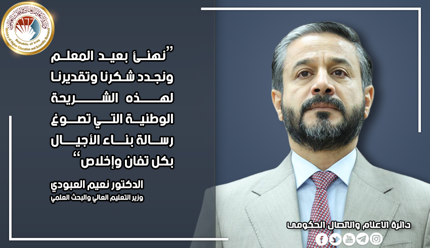 وبهذه المناسبة تجدد وزارة التعليم العالي والبحث العلمي شكرها وتقديرها لهذه الشريحة الوطنية المباركة التي تصوغ في كل مرحلة رسالة بناء الأجيال بكل تفان وإخلاص.