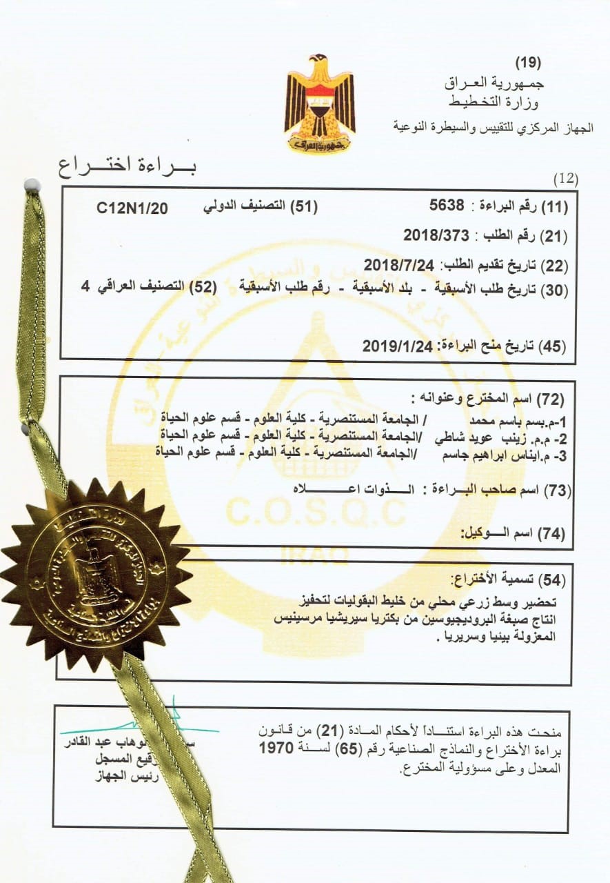حصل فريق بحثي مشترك في كلية العلوم بالجامعة المستنصرية، على براءة اختراع لتمكنه من تحضير وسط زرعي محلي من خليط البقوليات لتحفيز إنتاج صبغة البروديجيوسين (الحمراء) من بكتيريا سيريشيا مرسينيس المعزولة بيئياً وسريرياً.