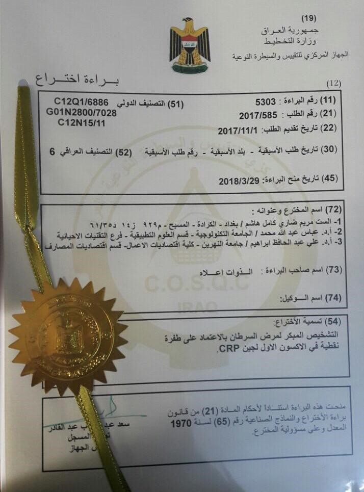 حصل التدريسي في كلية اقتصاديات الأعمال بجامعة النهرين الدكتور علي عبد الحافظ ابراهيم على براءة اختراع عن التشخيص المبكر لمرض السرطان بالاعتماد على طفرة نقطية في الاكسون الأول لجين CRP.