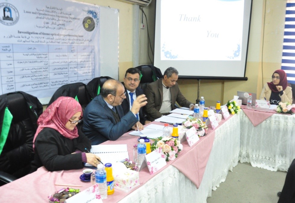 ناقشت رسالة ماجستير في قسم هندسة الليزر والالكترونيات البصرية في الجامعة التكنولوجية الخواص البصرية للأنسجة البيولوجية باستخدام تأثير الليزر بطرق مختلفة .
