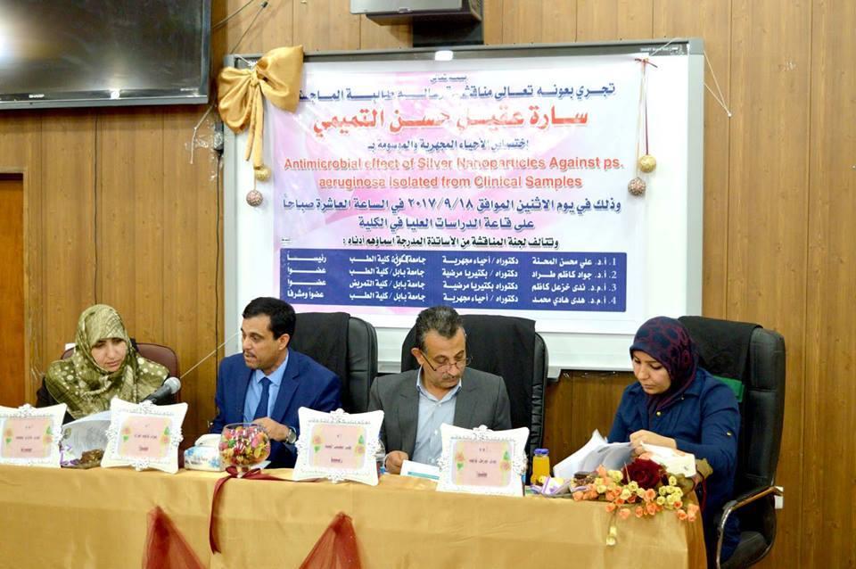 ناقشت رسالة ماجستير في كلية الطب بجامعة بابل تأثير المايكروبي المضاد لدقائق الفضة النانوية ضد بكتريا الزوائف الزنجارية المعزولة من عينات سريرية، للطالبة سارة عقيل التميمي.