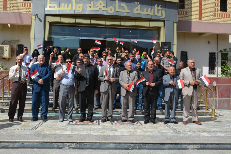 نظمت جامعة واسط وقفة وطنية شارك فيها أساتذة وطلبة ومنتسبي الجامعة للتعبير عن رفضهم لمحاولات تقسيم العراق.
