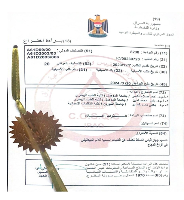 Universities of Al-Nahrain and Mosul obtained a joint patent on designing a pressure measuring device to detect thresholds that cause mechanical pain in chicken chicks.