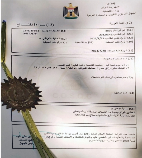 University of Al-Qadisiyah obtained a patent on preparing of new types of amides derived from the carboxylic acids of oxazoles as a drug for the treatment of liver cancer.