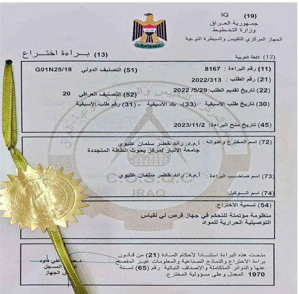 University of Anbar obtained a patent on an automated system to control a disk device to measure the thermal conductivity of materials.