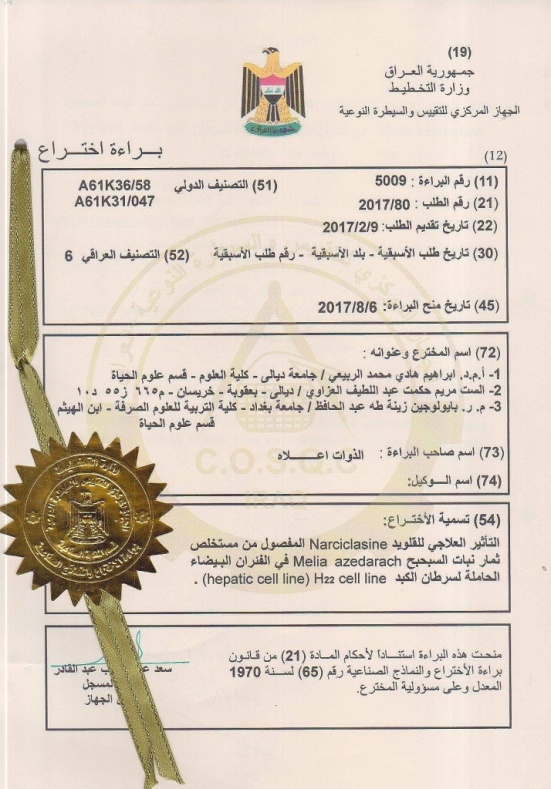 Faculty members in the Universities of Baghdad and Diyala obtained a joint patent on the therapeutic effect of the extracted alkaloids from the fruits of the Meliaazedarach plant on white mice with liver cancer.