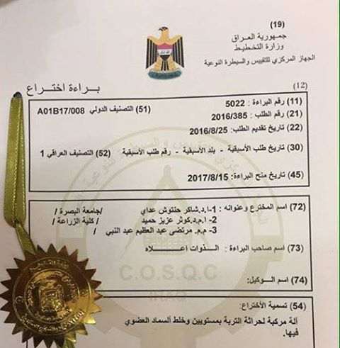 Faulty members in the College of Agriculture, University of Basra obtained a patent on manufacturing a machine to plow the soil with two levels and mix the organic fertilizers.