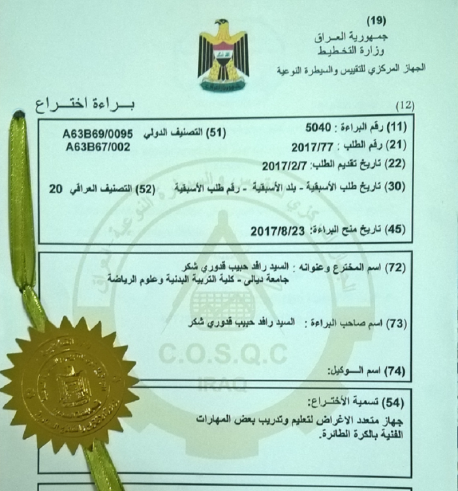 A faculty member in the College of Physical Education and Sports Sciences, University of Diyala obtained a patent on designing a multi-purpose device for teaching and training technical skills of volleyball.