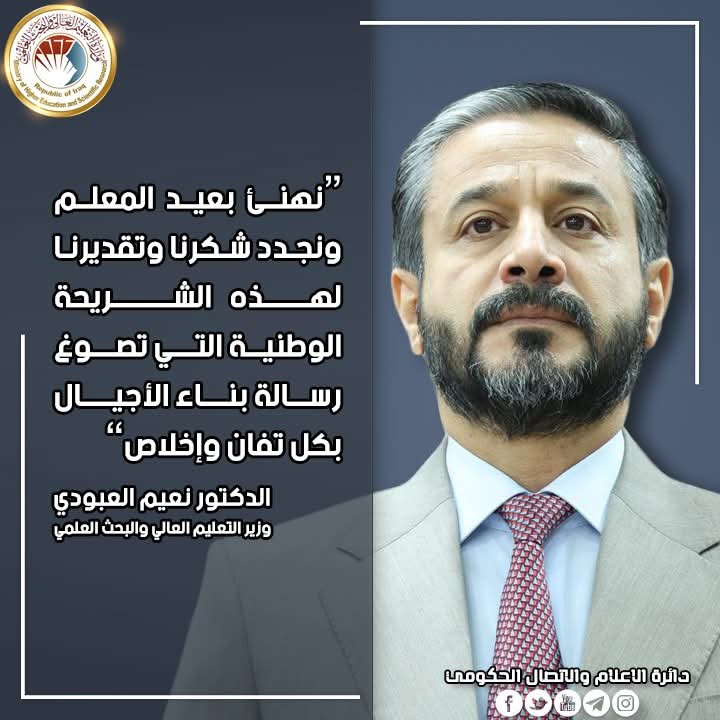His Excellency, Minister of Higher Education and Scientific Research, Dr. Naeem Al-Aboudi congratulated the educational family on Teacher’s Day, in which we draw noble values that derive their content from the supreme constants and authentic principles of our noble Iraqi people.