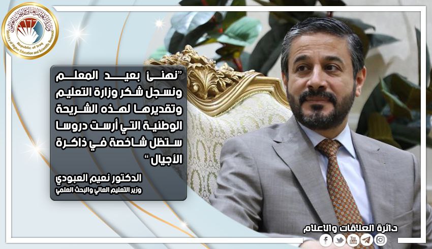 His Excellency, Minister of Higher Education and Scientific Research, Dr. Naeem Abd Yaser Al-Aboudi congratulated all the staffs of the fields of education on the occasion of Teacher's Day, which sums up a full journey of values, ethics and shouldering responsibilities to achieve the educational message and its lofty goals.